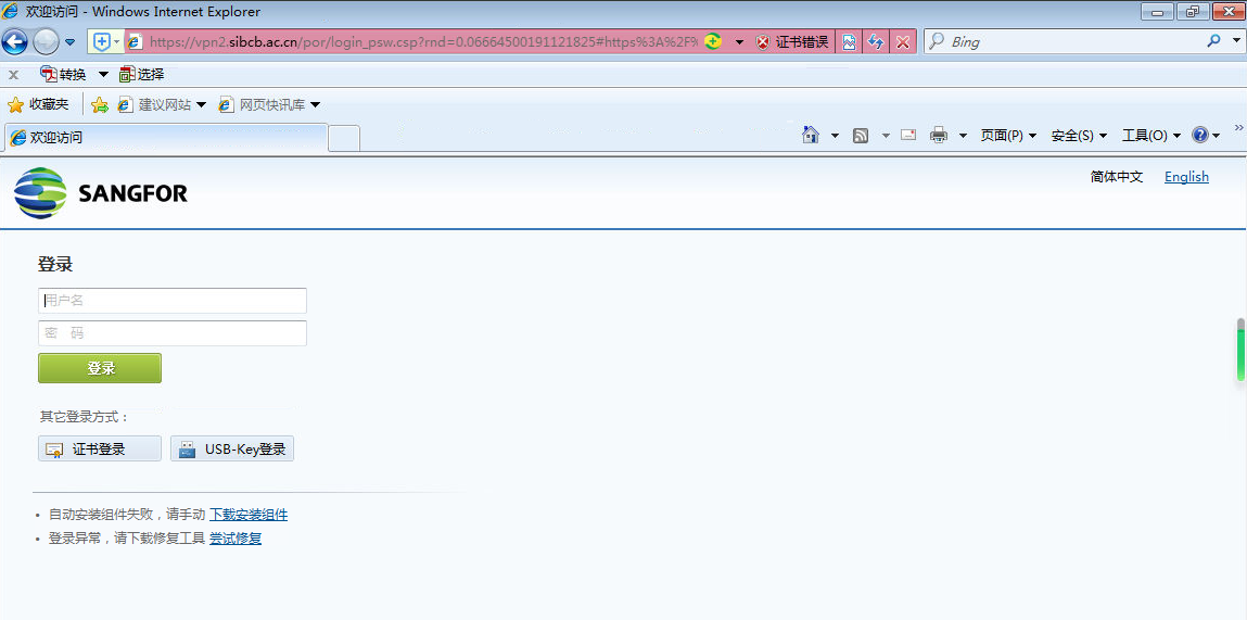 2.使用VPN用戶名和密碼進行登錄,如無VPN賬號請聯系support@sibcb.ac.cn。首次使用系統會自動安裝組件,若不成功,請手動下載安裝組件。 3.組件安裝成功后,系統會在您的電腦桌面上生成一個快捷鏈接的圖標(EasyConnect) 4.登錄成功后請點擊"OA辦公自動化系統"進入 5. VPN每次使用完畢請注銷。不可以時登兩個VPN,如有其他正在連接的VPN,請先注銷然后再登錄我們的VPN。 6.如有問題請發送郵件到support@sibcb.ac.cn。
