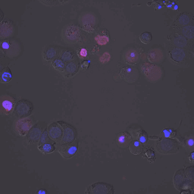 藍色和紅色為特殊的核染料,畫面中紅色指示凋亡的細胞