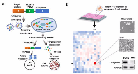 然而,該領域長期受制于一個關鍵瓶頸:分子膠降解劑的發現高度依賴偶然性,缺乏系統高效的篩選體系。為破解這一難題,姜海研究組開發了新型高通量篩選平臺。降解劑篩選方法的困境在于:化合物誘導目標蛋白降解的本質是細胞內的微觀分子事件,本身不產生可直接觀測的宏觀表型。對此,姜海團隊設計了一種低成本、易操作的自動化篩選體系——通過將疾病靶點蛋白與條件性自殺蛋白FKBP12 F36V-CASP9融合,并利用病毒載體構建穩定表達細胞系。該設計的核心邏輯是:當條件性自殺蛋白被激活時,細胞將在數小時內完全死亡;而若篩選化合物能成功降解目標蛋白(連帶降解與之融合的自殺蛋白),則細胞在加入激活劑前已無自殺蛋白存在,可維持正常存活。由此,原本不可見的蛋白降解過程被轉化為清晰的"死亡-存活"宏觀表型,通過384孔板的自動化明場成像,即可發現具有細胞存活的細胞孔并鎖定潛在降解劑,再通過Western blot等技術驗證。基于這一DEFUSE(DEath FUSion Escaper)篩選體系,研究人員可在一周內完成上萬個化合物對數十個靶點蛋白的篩選,不僅大幅提升了效率,更以低成本、高靈敏度特性為蛋白靶向降解研究提供了通用工具。