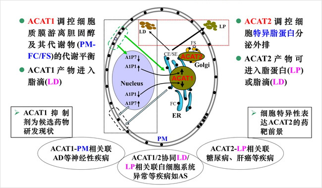 ???????ACAT是細胞內唯一催化游離膽固醇與長鏈脂肪酸生成膽固醇酯的酶,是膽固醇代謝平衡的關鍵酶,對細胞生命、細胞命運與細胞活動發揮極重要的功能作用。ACAT家族有ACAT1和ACAT2,ACAT1在人體所有組織細胞中表達,而ACAT2具有細胞、發育、種族特異性高/低水平表達。
