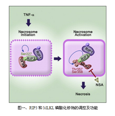 程序性細胞壞死是一種由激酶的激活而引發的細胞死亡方式。死亡受體(例如TNFR1)的激活最終可以誘發程序性細胞壞死,而起動細胞壞死的信號轉導主要依賴于激酶RIP1和RIP3的調控。細胞壞死發生之后,RIP1與RIP3相結合并激活了RIP3的激酶活性,然后RIP3發生自身磷酸化,使其可以特異性的和底物MLKL相結合,MLKL進而被RIP3磷酸化。這時的RIP1/RIP3/MLKL形成一個有活性的細胞壞死復合體,傳遞死亡信號給下游,使細胞壞死得以最終發生。