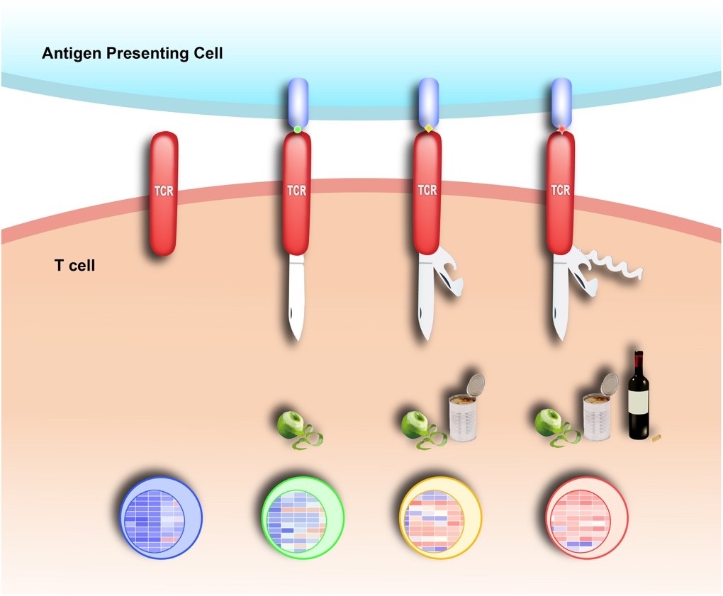 圖2. TCR結(jié)構(gòu)多態(tài)性模型。TCR可以在不同抗原刺激下產(chǎn)生不同的開放性構(gòu)象,從而引發(fā)特異性的下游信號(hào)通路,使得T細(xì)胞獲得不同的效應(yīng)功能。這個(gè)模型解釋了T細(xì)胞獲得抗原特異性的信號(hào)基礎(chǔ)。