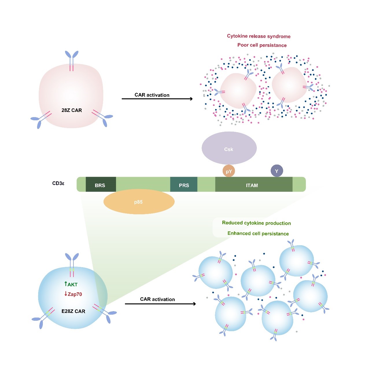 圖4. 基于CD3e 蛋白多重信號(hào)功能而設(shè)計(jì)的新型CAR-T細(xì)胞療法。TCR的CD3e 鏈具有特殊的信號(hào)轉(zhuǎn)導(dǎo)功能,可以同時(shí)招募抑制性分子Csk和活化性分子PI3K。將CD3e 胞內(nèi)區(qū)加入臨床使用的CAR序列中,可使得CAR-T細(xì)胞生長持續(xù)性更好,抗腫瘤功能更強(qiáng),并且細(xì)胞因子釋放綜合癥的風(fēng)險(xiǎn)降低。